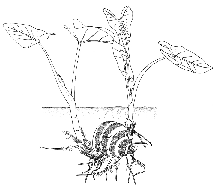 ![]() Xanthosoma corm in July. The lateral buds will produce new corms